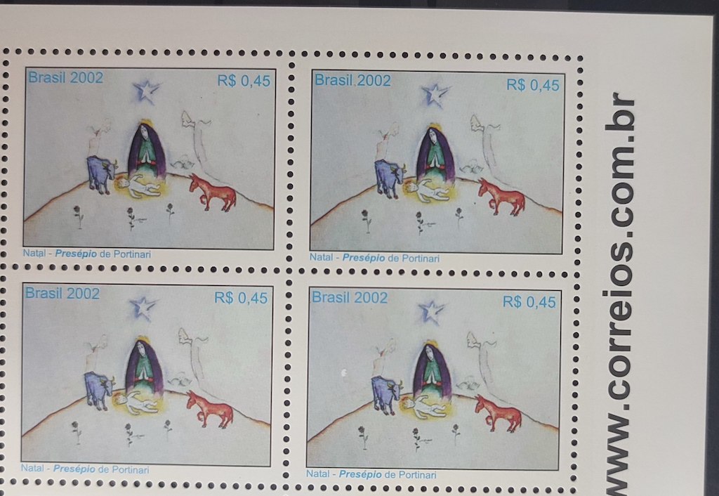 Categorias: Comemorativo e Especial, SELOS BRASIL Tags: Artes, Burros, Natal, Portinari, Quadras, Religião, Selos 2002, Vacas, Vinheta Site