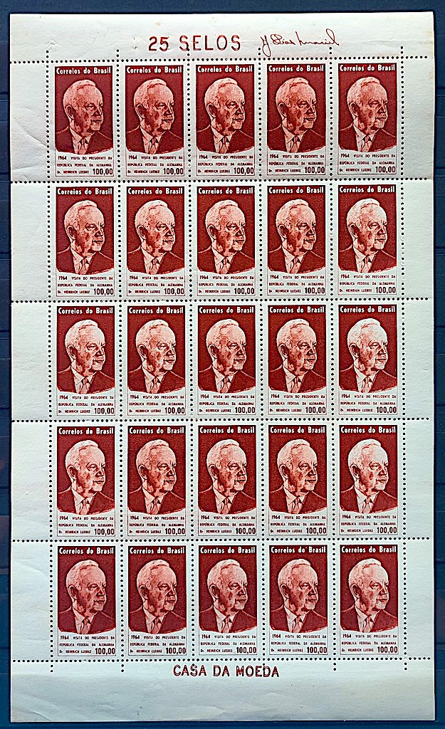 Categorias: Comemorativo e Especial, SELOS BRASIL Tags: Alemanha, Chefes de Estado, Folhas, Heinrich Lubke, Personalidades, Presidentes, Selos 1964