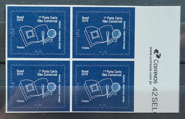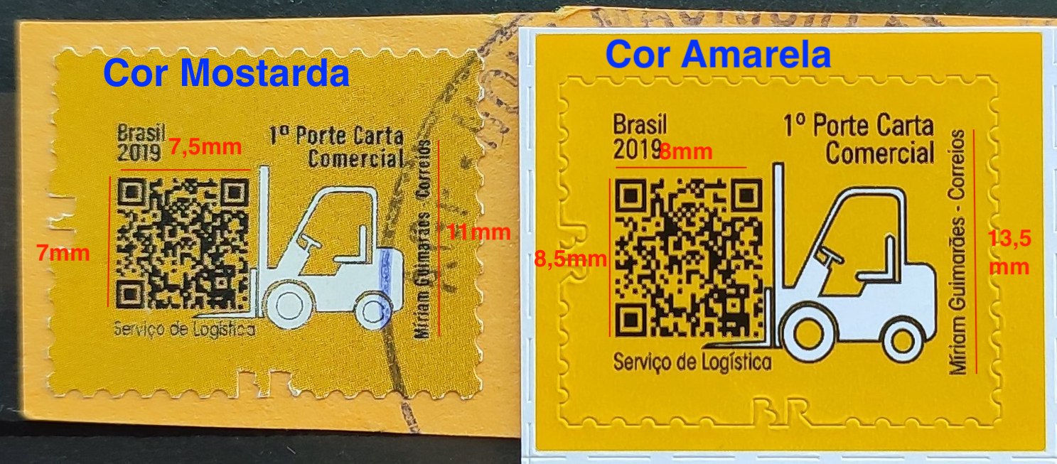 *A segunda imagem compara a trinca de selos falsos (na cor mostarda) com um selo original (na cor amarela).